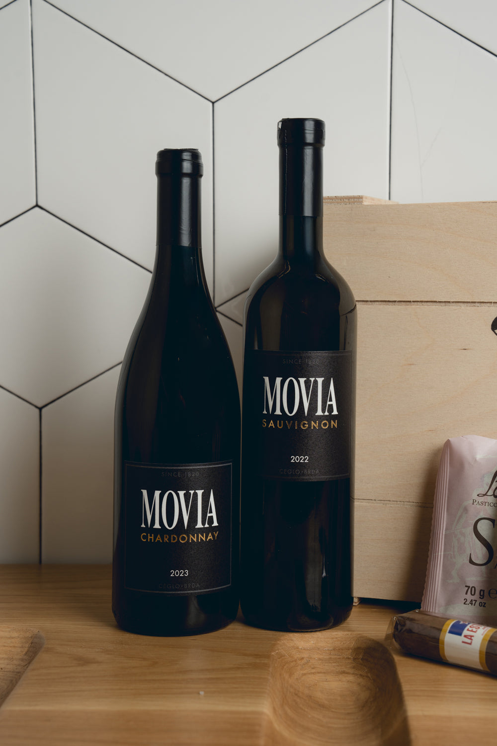 Το Wine Box "Movia" αποτελείται από ένα ξυλοκιβώτιο που περιέχει μία φιάλη Chardonnay 2023 (BIODYNAMIC) - Movia, μία φιάλη Sauvignon Blanc 2023 (BIODYNAMIC) - Movia, τρία κομμάτια panettone Loison και ένα πούρο Estrella Gigante Cigar.