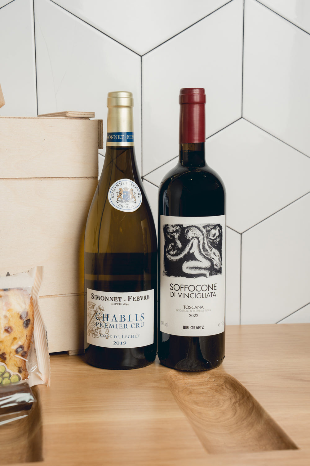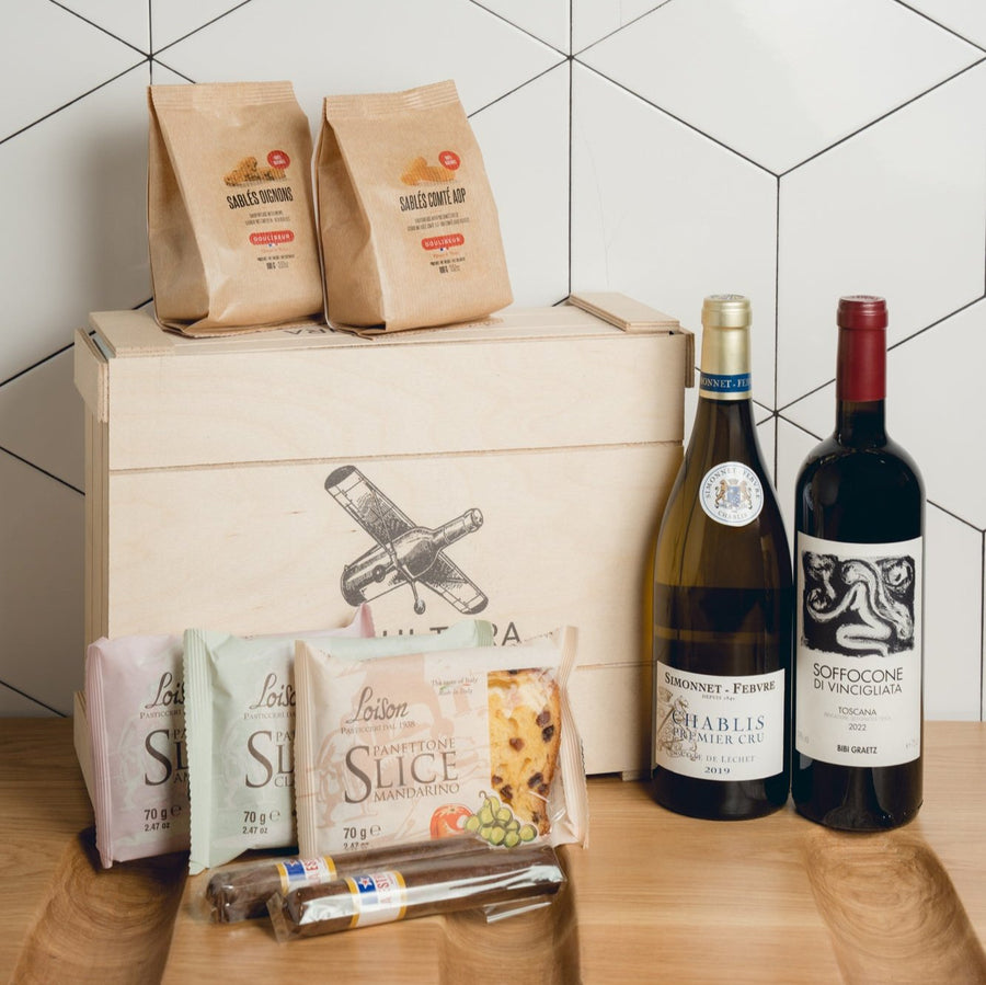 Το Wine Box "Bibi Graetz & Simonnet Febvre Selection" αποτελείται από ένα ξυλοκιβώτιο που περιέχει μία φιάλη Soffocone di Vincigliata IGT Toscana 2022 - Bibi Graetz, μία φιάλη Chablis Premier Cru Côte de Léchet 2019 - Simonnet Febvre, τρία κομμάτια panettone Loison, δύο πακέτα αλμυρά κουλουράκια Goulibeur και δύο πούρα Estrella Gigante Cigar.