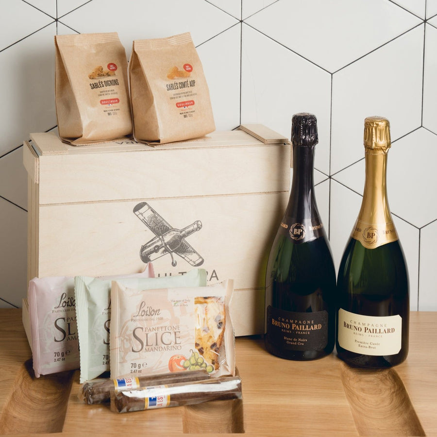 Το Wine Box "Bruno Paillard" αποτελείται από ένα ξυλοκιβώτιο που περιέχει μία φιάλη σαμπάνιας Grand Cru Blanc de Noirs N.V. - Bruno Paillard, μία φιάλη σαμπάνιας Première Cuvée Extra Brut Champagne N.V. - Bruno Paillard, τρία κομμάτια panettone Loison, δύο πακέτα αλμυρά κουλουράκια Goulibeur και δύο πούρα Estrella Gigante Cigar.