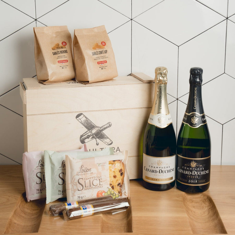 Το Wine Box "Canard-Duchêne" αποτελείται από ένα ξυλοκιβώτιο που περιέχει μία φιάλη σαμπάνιας Demi-Sec N.V. - Canard-Duchêne, μία φιάλη σαμπάνιας Vintage 2014 - Canard-Duchêne, τρία κομμάτια panettone Loison, δύο πακέτα αλμυρά κουλουράκια Goulibeur και δύο πούρα Estrella Gigante Cigar.